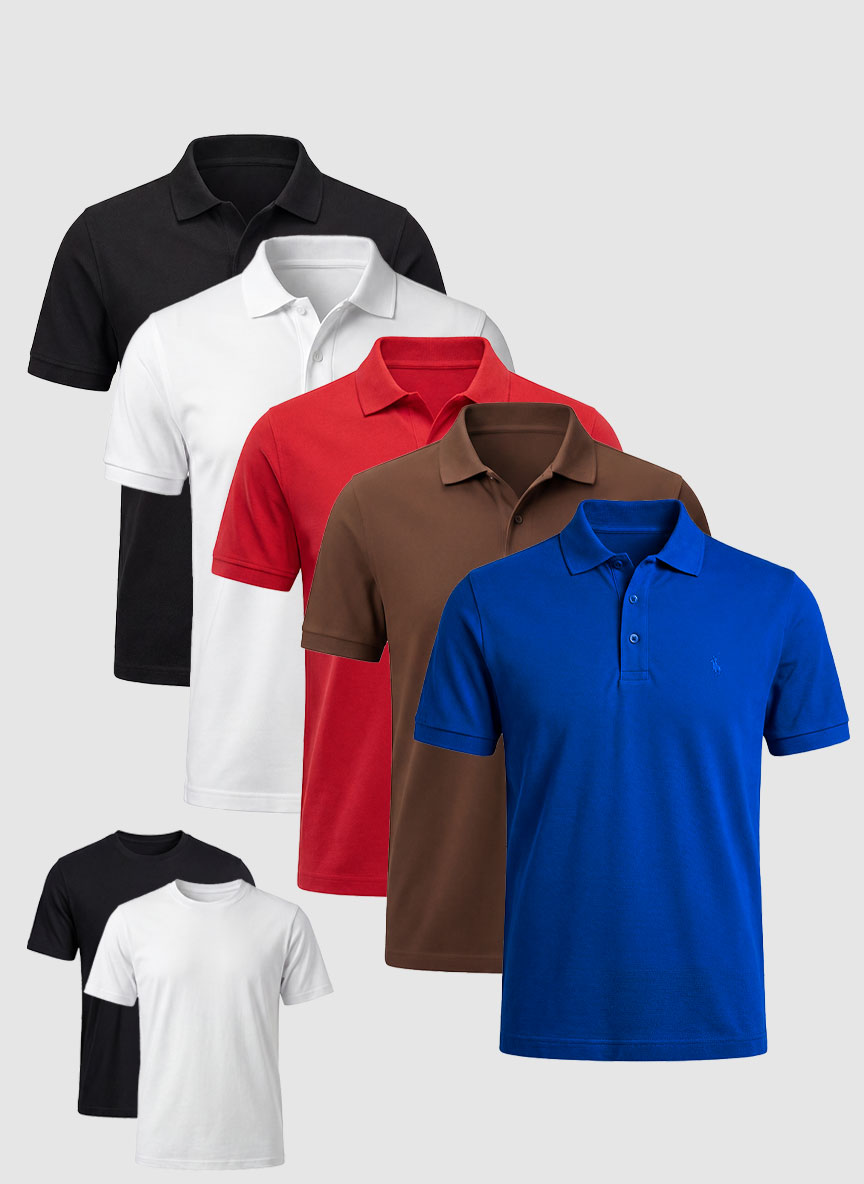 Buy Pack of 5 Polo Shirts and get 2 Round Neck T-Shirts FREE. Best deal for maximum wardrobe coverage