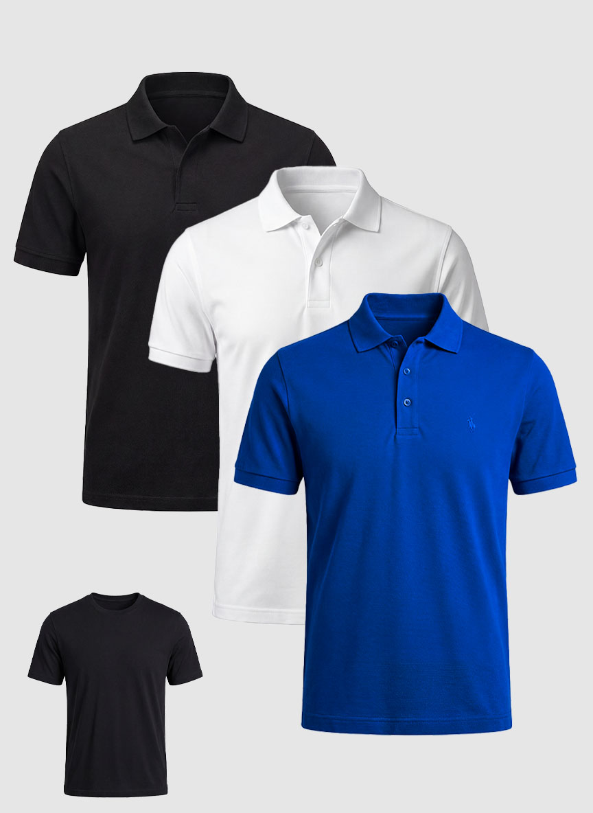 Buy 3 Polo Shirts and get 1 Round Neck T-Shirt FREE. Perfect for weekly rotation + a bonus tee.